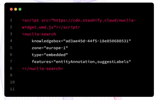 The AI search engine delivers the right answers from your text, documents and video. Get 100% out-of-the-box AI search and generative answers from your documents, texts, and videos while keeping your data privacy intact. Nuclia automatically indexes your unstructured data from any internal and external source, providing optimized search results and generative answers. It can handle video and audio transcription, image content extraction, and document parsing. Allow your users to search your data not only by keywords but also using natural language, in almost any language, and get the right answers. Effortlessly generate AI search results and answers from any data source. Use our low-code web component to integrate Nuclia’s AI-powered search in any application or use our open SDK to create your own front-end. Integrate Nuclia in your application in less than a minute. Choose the way to upload data to Nuclia from any source, in any language, in almost any format.