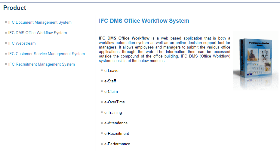IFC DMS Office Workflow is a web based application that is both a workflow automation system as well as an online decision support tool for managers. It allows employees and managers to submit the various office applications through the web. The information then can be accessed outside the compound of the office building.