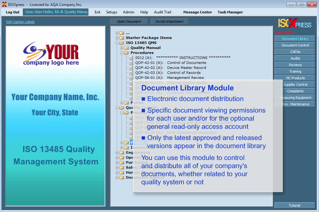 IMSXpress is a sophisticated document control, regulatory compliance, and quality system management platform used for operating ISO 13485 and FDA 21 CFR part 820 quality system that include document distribution, document control, CAPA, complaints, audits, training, MDR, supplier control, NC product, and more. Available as a local install or cloud data hosting, this cutting-edge software comes pre-loaded with template manuals and procedures, employee training booklets, and audit checklists.