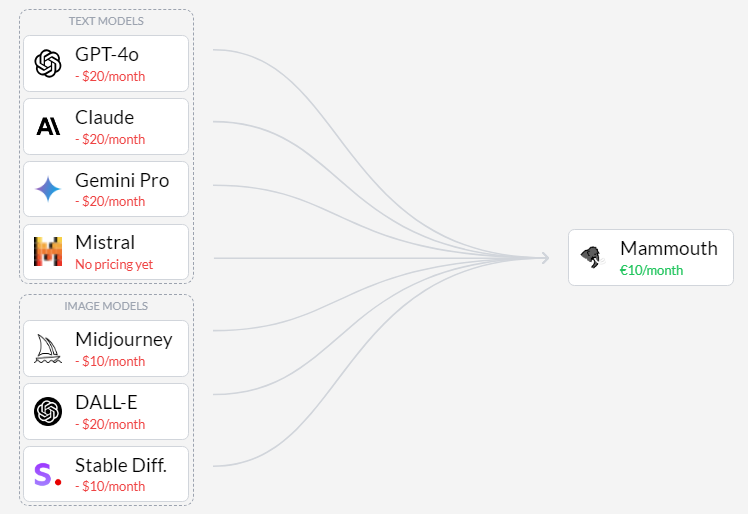 Get access to Claude 3.5 Sonnet, GPT-4o, Mistral, Llama 3, Gemini, Dall-E, Stable Diffusion, and Midjourney in one place. Create stunning, high-quality images from text descriptions using advanced AI algorithms, perfect for various creative and professional applications. Quickly send your prompt to another model to get a different result and benefit from the diversity of possible answers. The future is multi-models. Access and review past conversations, enabling continuity in discussions and easy reference to previous information exchanges. Communicate and generate content in multiple languages, breaking down language barriers and expanding the tool's global usability. Easily upload and analyze images or documents, allowing the AI to process visual information and extract insights from various file types. Mammouth automatically accesses up-to-date information from the internet directly, providing real-time data for your queries.