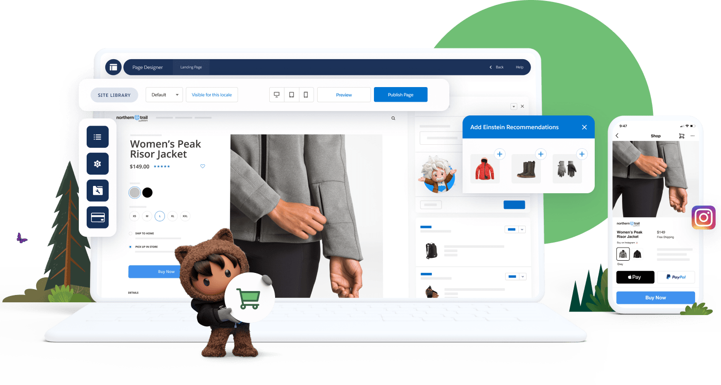 Connect to shoppers anytime, anywhere with our B2C ecommerce solution. See how Salesforce B2C Commerce can help you create unified, intelligent digital commerce experiences — both online and in the store. Salesforce B2C Commerce (formerly Commerce Cloud Digital) empowers you to connect with consumers and deliver personalized shopping experiences across all commerce channels — web, mobile, social, and even in-store. This powerful platform enables unique digital experiences and frictionless transactions at every touchpoint. Launch new sites, expand into new geographies, increase sales, and grow your business faster with hundreds of out-of-the-box features. Reduce abandoned carts with proven best practices, including saved carts, optimized checkout flows, and payment accelerators. Extend your reach by merging digital commerce with social channels and online communities, such as Instagram and Facebook.