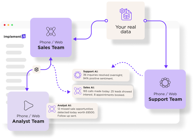 Implement AI offers a tool that helps businesses deploy a scalable digital workforce of coordinated AI agents across sales, support, operations, and success functions, turning isolated AI tools into an AI Operating System (AIOS) that works with real business data and systems like CRM, email, voice, and messaging to execute tasks autonomously and collaboratively. Its AI agents are multi-skilled and role-specific, designed to find missed revenue opportunities, launch outbound campaigns, follow up inbound leads, deliver 24/7 customer support, triage tickets, analyse conversations for revenue signals, flag compliance risks, build dynamic knowledge bases, and transform call and email data into actionable insights. Unlike standalone chatbots, the AIOS provides shared memory and an agentic task engine that lets agents access live customer context, coordinate workflows, trigger tasks using business rules, and scale across departments.