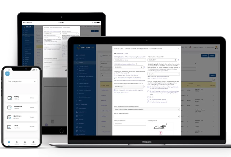InMyTeam is a powerful, all-in-one platform tailored for home care agencies and home health agencies, streamlining operations and boosting efficiency. For home care, InMyTeam addresses EVV compliance, claims management, and HR challenges, while for home health care, it simplifies OASIS assessments, unifies patient information, and supports PDGM quality episodes. No matter your agency’s focus – home care or home health care, InMyTeam provides the tools you need to maintain compliance, enhance operational efficiency, and deliver superior care. Focus less on administrative tasks and more on what matters most, your patients and clients. INMYTEAM is the only solution that allows you to manage all your patients. You can create different roles for employees that only need to have access. We have plans tailored to all sizes of agencies, from startups to mid-sized. We charge a flat fee for the software, and optional power tools are available.