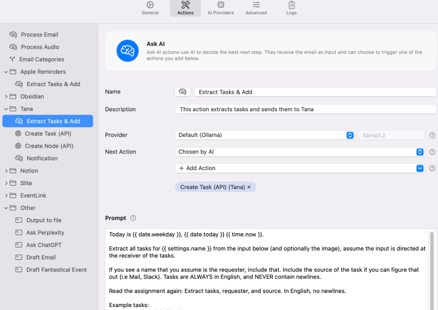 Focus on what matters, manage email, and automate tasks with AI-powered workflows. Use the cloud or privacy-first on-device AI. Bring your own API keys or use free local on-device AI with Ollama. Remove friction from your daily workflows. Build intelligent workflows that automatically flag critical messages and filter out noise. Extract tasks and send them to your favorite apps like Notion, Obsidian, or Tana. Use incoming email messages as input. Extract tasks and filter noise. Select anything on your screen as input and convert it to a task or memo. Use audio as input and build commands like "ask ChatGPT" or "add a reminder to call mom". Trigger actions from Raycast, shortcuts, or any app that supports callback URLs. Use online AI for more power or keep things on your Mac. Use AI to summarize, analyze, or extract, and give it powerful tools. Guide your AI by asking it multiple-choice questions.