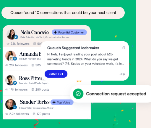 Get more exposure as an expert (and the opportunities that come with it). Consistently publish hit content to become the go-to expert in your niche. AI finds your ideal customers and helps you get a steady flow of inbound leads. Queue’s focused growth plan and AI tools help you win on LinkedIn. Quickly discover the exact topics and trends that resonate with your audience. Create content quickly with AI that sounds like you and brings out your unique voice. Queue is for subject matter experts, business professionals, solopreneurs, consultants, freelancers, coaches, and executives who want to get the exposure they deserve. If you have deep knowledge and experience to share, Queue will help you turn that knowledge into a strong reputation and professional personal brand that attracts organic leads. Queue optimizes the mix of opportunities to help you achieve your goals while growing exposure at the same time.