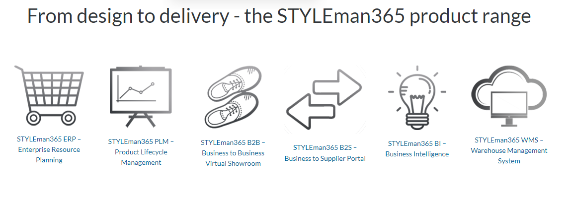 STYLEman is a management software made for the specific needs of apparel and footwear businesses. STYLEman's full suite includes Enterprise Resource Planning (ERP), Product Lifecycle Management (PLM), mobile service for salesmen and customers, Warehouse Management Software (WMS), and Business Intelligence (SI) modules. The software also allows businesses to sort and manage Bills of Materials, Bills of Labor, purchase and selling prices, marketing information, among many others.
