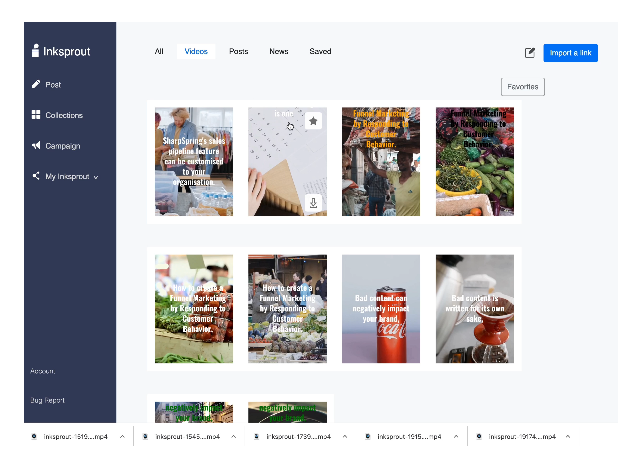 Make engaging, bite-size, social videos in seconds from your blog with AI-powered captions. Monitor trends in your industry and niche. Quickly share the news with your networks with Inksprout's intro suggestions. Quickly generate, download, and share bite-size videos on your marketing channels. The app allows users to import their favorite blogs by URL. Any blog or website that has a valid URL can be imported, summarized and turned into videos using Inksprout. The API/CSV automation feature in Inksprout allows users to automate their content creation and publishing process by integrating their Inksprout account with external platforms using APIs or CSV files. With this feature, you can upload CSV files with content or URL, and to generate summarized captions. Additionally, you can use APIs to fetch data from other platforms, such as blogs or news websites, and automatically create summaries based on the fetched data.