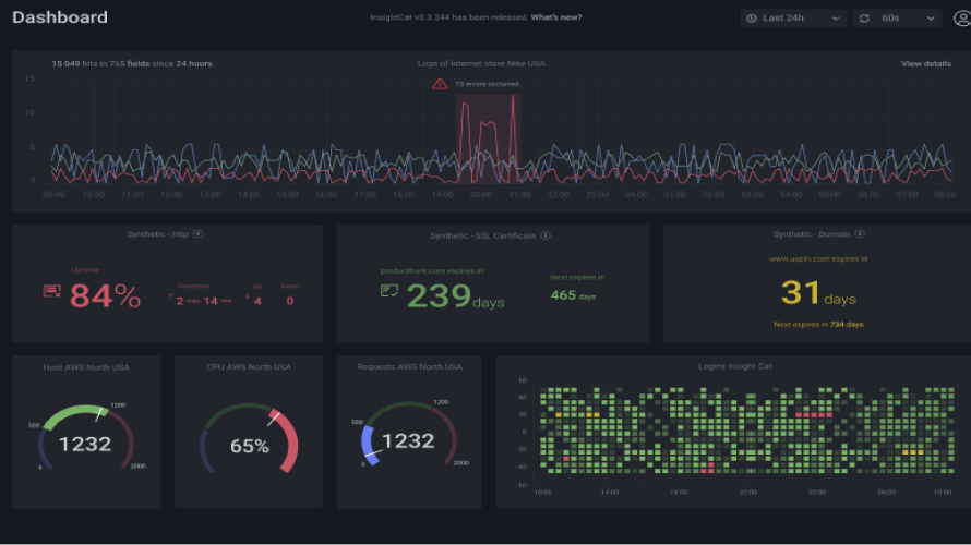 InsightCat is a full-stack infrastructure monitoring solution to search, analyze, and aggregate system metrics in one place. The solution was developed to be intuitive and cover the most vital requests of DevOps, System administrators, SecOps, and IT specialists related to infrastructure monitoring, security, log management, etc.