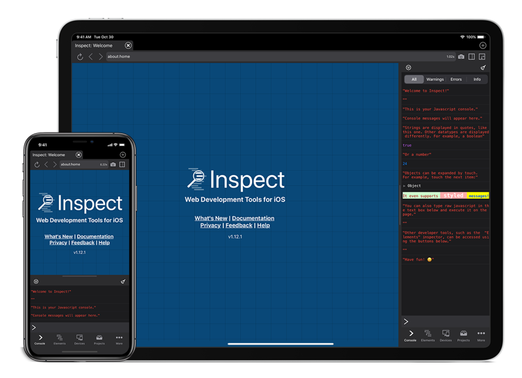 Desktop-class web development tools on iOS. Inspect is a web browser for iPhone and iPad that provides desktop-class web development tools and features. Inspect provides a JavaScript console that shows log messages, JavaScript errors, and accepts input.