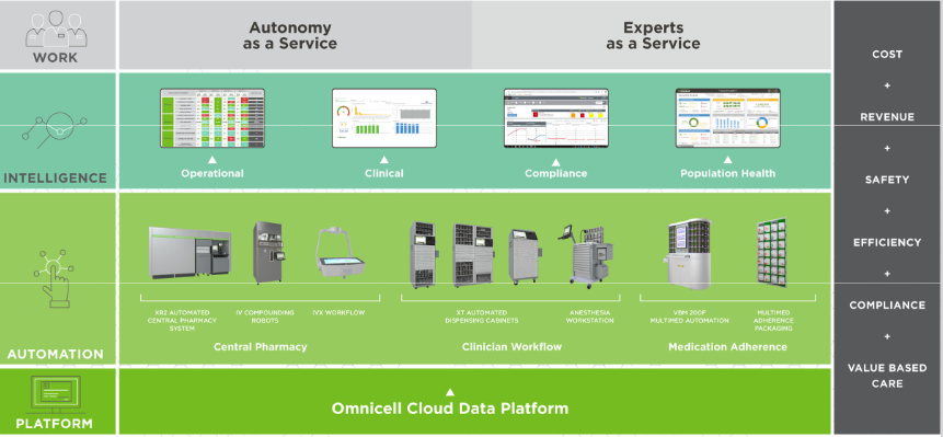 Start Your Journey to The Autonomous Pharmacy. Explore how automation, intelligence, and technology-enabled solutions, powered by a cloud data platform, are leading the way to zero-error medication management. Our portfolio crosses the entire continuum of care, from hospital to home. Features: Intelligence. Predictive analytics, powerful insights, and advisory services to help you optimize inventory, manage diversion, and elevate pharmacy performance. Central Pharmacy Dispensing. Advanced robotics and intelligence to support error-free medication management and free pharmacy time for higher-value clinical work. Central Pharmacy IV Compounding. Advanced robotics and workflow management systems for sterile IV compounding that make it safer, more compliant, and easier to meet demand accurately. Point of Care. Workflow automation tools to ensure clinicians have safe, efficient, and secure access to the right medication at the right time across all points of care.