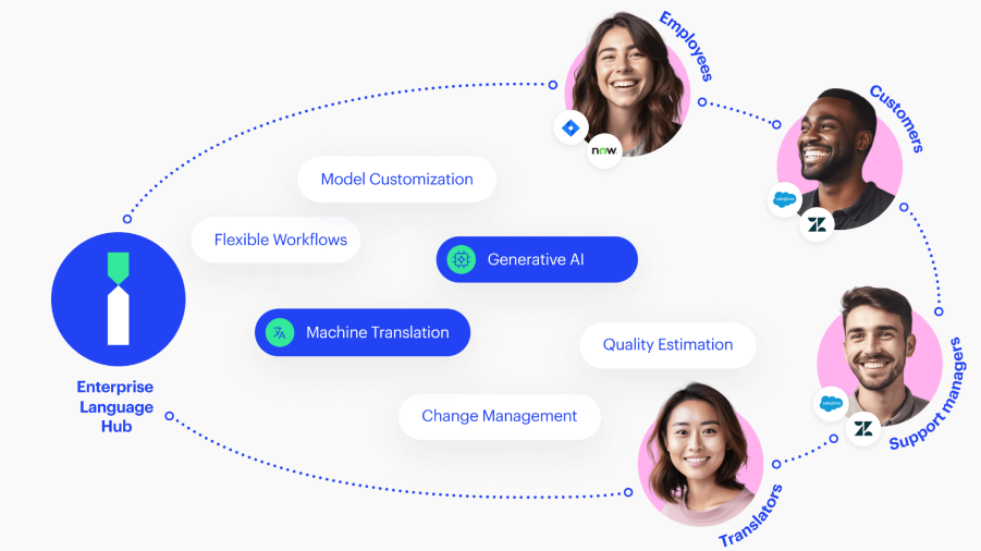 Machine translation and multilingual generative AI platform for global businesses. We deliver immediate, tailored, and personalized language experience in all the software systems your customers and teammates already use, supporting over 650 languages. Save up to 95% on translations by combining best-fit machine translation with source quality improvement and automatic post-editing based on GenAI. Let us take care of your custom MT engines. Empower customer support teams with real-time machine translation for chats and tickets to help customers 24/7 in their native language. Globalize self-service by on-the-fly translation of knowledge bases and community forums, tailored to your data. Our language hub translates documents, support tickets, and enterprise apps so everyone’s on the same page and included. Works as a translation portal and through integrations with Atlassian, Microsoft, ServiceNow, Zendesk, and other tools.