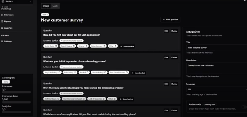 Conducting research today is already demanding. Eliminate outdated, time-consuming methods with our AI-driven platform. We empower you to streamline interviews, surveys, and analytics with efficiency and speed like never before. Gain valuable insights from customer feedback with AI-driven interviews that provide in-depth analysis and trends. Create seamless, AI-moderated interviews that ensure a consistent and smooth experience for both your team and customers. Easily scale your research efforts by conducting multiple interviews at once, allowing you to gather insights from thousands of customers simultaneously. Leverage automated reports and analytics to make informed, data-driven decisions that improve your product and align with customer needs. Users can easily create custom interviews, generate questions based on context, and choose the interviewer type. Whether it's a structured interview or open-ended queries, Replio allows full control over the flow to match your research needs.