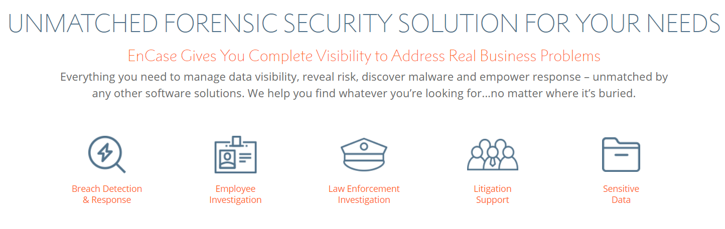 OpenText™ Security Suite, powered by OpenText™ EnCase™, provides 360-degree visibility across laptops, desktops and servers for proactive discovery of sensitive data, identification and remediation of threats and discreet, forensically-sound data collection and investigation. With agents deployed on more than 40 million endpoints, clients that include 78 of the Fortune 100 and more than 6,600 EnCE™ certified users, Security Suite delivers the industry gold standard for incident response and digital investigations. EnCase solutions help enterprises, government agencies and law enforcement address a range of needs around risk and compliance, file analytics, endpoint detection and response (EDR) and digital forensics with the most trusted digital forensics and cybersecurity software. Solving problems that often go undetected or unsolved on the endpoint, Security Suite restores the confidence of companies and their customers with unparalleled reliability and breadth of coverage.
