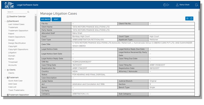The Software allows the user to store and manage the complete case details i.e. Case Description, Court, Case Type, Court Type, Title of Litigation Case (X vs Y), FIR details, Opposition party & advocates, etc. The complete processing, storage & retrieval of case documents is carried out from the Iolite Litigation Management Software making the work of law firms highly simplified and productive.