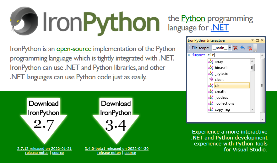 IronPython is an open-source implementation of the Python programming language which is tightly integrated with .NET. IronPython can use .NET and Python libraries, and other .NET languages can use Python code just as easily. Experience a more interactive .NET and Python development experience with Python Tools for Visual Studio. IronPython is an excellent addition to .NET, providing Python developers with the power of the .NET. Existing .NET developers can also use IronPython as a fast and expressive scripting language for embedding, testing, or writing a new application from scratch. The CLR is a great platform for creating programming languages, and the DLR makes it all the better for dynamic languages. Also, the .NET (base class library, presentation foundation, etc.) gives developers an amazing amount of functionality and power. IronPython uses Python syntax and standard libraries and so your Python code will need to be updated accordingly.