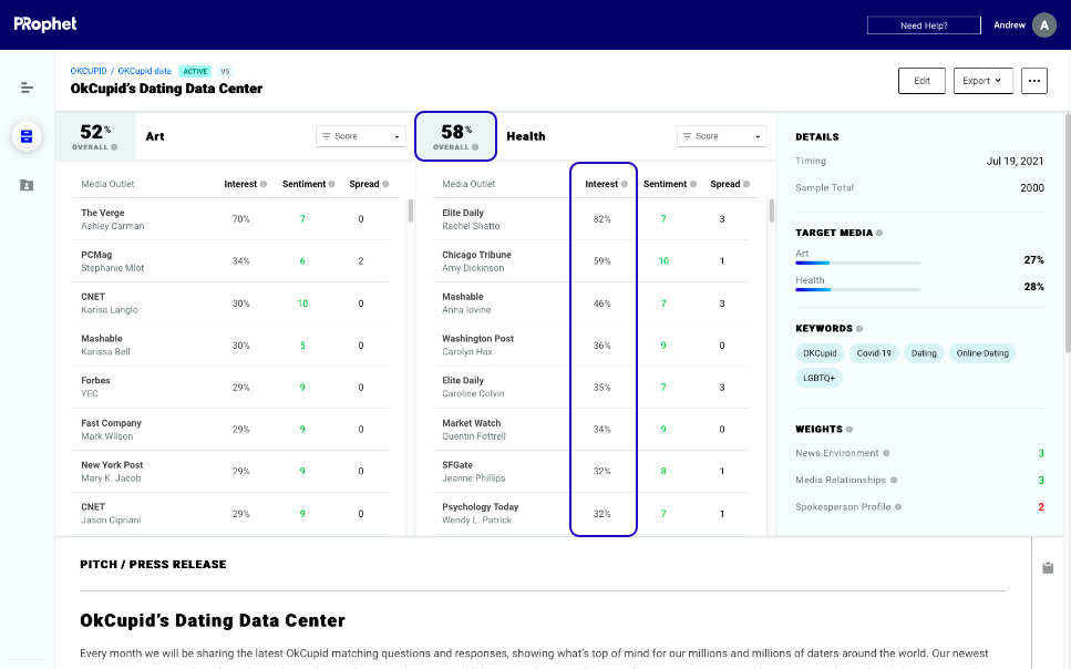 PRophet brings new value to every layer in the public relations ecosystem: from generating richer insights for better strategies to working in tandem with traditional platforms to perform even smarter and more efficiently, to creating more relevant and successful pitches and, as a result, better relationships with journalists. Optimize your crisis response or reputational campaign by knowing with greater certainty how and which media will react to an emerging issue. Test, retest and run your pitch over and over again to optimize your language and targets before going to market with your pitch. PRophet predicts which media are most likely to be interested in your pitch and help you uncover new reporters, dramatically increasing your odds for placement. Reduce pitch time by up to 50% while increasing placements by up to 100% so you can spend more time on other high-value tasks.
