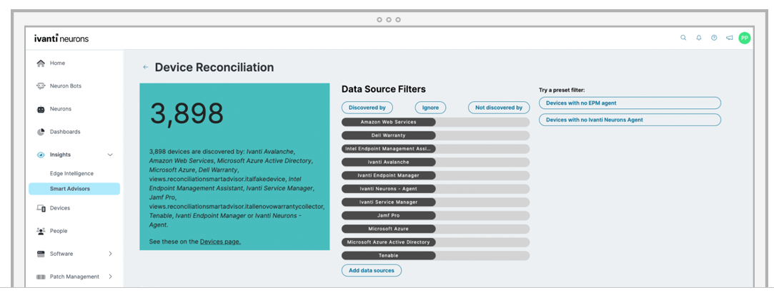 Detect new or unknown devices joining your network instantly. Ivanti Neurons for Discovery delivers accurate and actionable asset information in minutes. Determine what users and endpoints connect to the network, when they connect, and what software is installed on them. Now enjoy visibility in real-time using active and passive scanning and third-party connectors. Take advantage of actionable insight with normalized hardware and software inventory data, software usage information automatically feeding configuration management and asset management databases, along comprehensive service maps. Ivanti Neurons for Discovery is an approved inventory management partner of Google, enabling the import and reconciliation of Google OS devices from Google Workspace into the Ivanti Neurons platform through the Google Chrome Enterprise connector. This helps customers get a complete picture of their assets, regardless of what unified endpoint management tool they use.