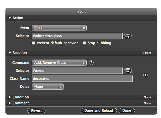 IxEdit is a JavaScript-based interaction design tool for the web. With IxEdit, designers can practice DOM-scripting without coding to change, add, move, or transform elements dynamically on your web pages. Especially, IxEdit must be useful to try various interactions rapidly in the prototyping phase of your web application. Interactions are visual changes of the screen which occur when users act on user interface elements. In other words, interactions are the behaviors of the user interface. For instance, when a user click a button, an image switches to another, or when a user drags an edge, the viewport expands. Those are interactions. Users are doing their jobs with a computer through various interactions generally. To implement interactions on a web page, programming with JavaScript is needed. However, it is hard to manage JavaScript for many designers. Therefore, making well-designed web interactions is difficult in general. IxEdit solves this problem.