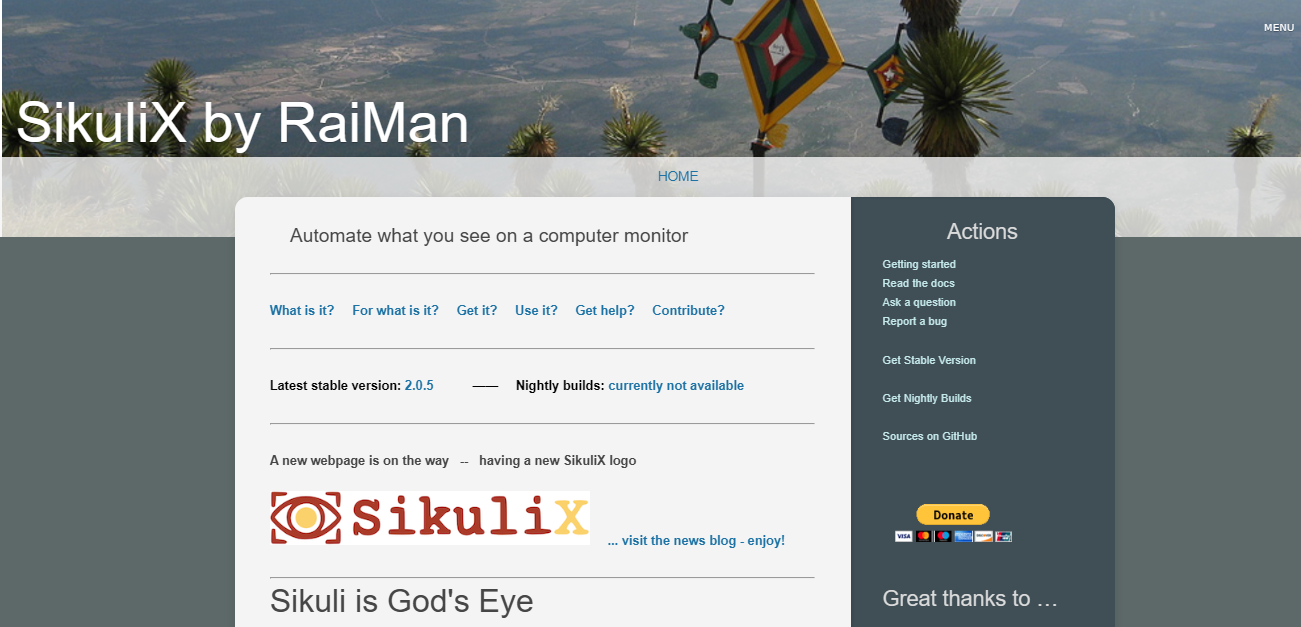 SikuliX is an open source automation tool that enables users to automate any visible element on their desktop screens across Windows, Mac, or certain Linux/Unix systems. It utilizes image recognition powered by OpenCV to identify and interact with screen elements, allowing for the automation of tasks that are otherwise difficult to script. SikuliX offers an Integrated Development Environment (IDE) for writing visual scripts using screenshots, as well as a Java API for integrating image-based automation into existing applications. The software packages representing SikuliX are open source under the MIT license and publicly available for whatever use. SikuliX internally uses OpenCV to support image-related features and Tesseract for text features. The latest stable version, SikuliX 1.1.1, is recommended for use.