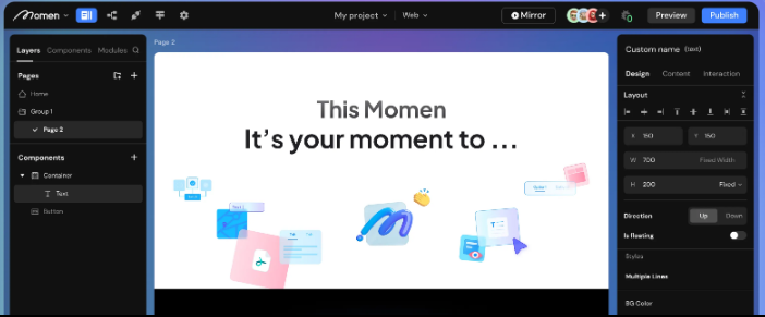 From MVP to scaled SaaS, build your custom apps with a smooth learning curve, all powered by Momen. Streamlined from prototype design to app deployment, with robust built-in backend, say farewell to traditional dev. Create apps in weeks, and iterate your ideas with ease, no coding needed. Project-based pricing without overage fees and third-party backend service, estimate costs upfront. Advanced collaboration workflows with access control, build fully custom apps for million-user projects from the start. Build every part of your product visually in Momen's drag-and-drop editor. Clarify user journey and interaction, and unleash your inner designer's creativity. See holistically how users journey through your product with our interactive and dynamic canvas. Watch your product come to life in real-time with live preview as you build and test its features, with the browser preserving the navigation state.
