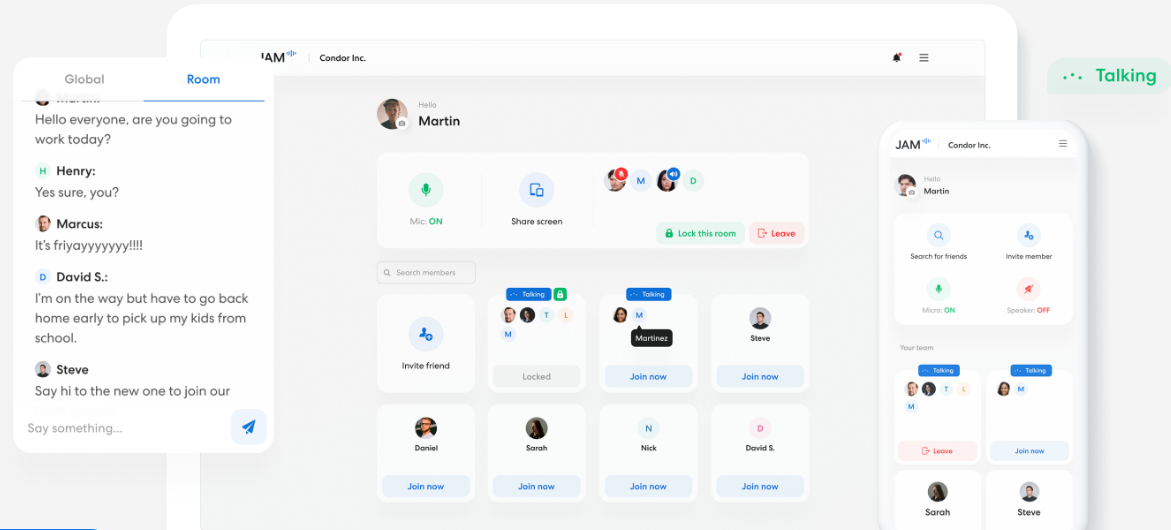 Spontaneous, permissionless calling. Sometimes a quick chat is all you need to get things done. Jam is simple click-to-talk, audio-first software without the endless fuss of Zoom links and Meet invites. Jam with anyone or everyone instantly. Once you’re logged in with your work email, simply click a colleague’s name to talk or hop into an ongoing conversation. Connecting on Jam feels just like popping by someone’s desk. This meeting could be an email on Jam. Don’t waste time juggling disjointed Slack threads. Don’t kill your workflow with scheduled calls. Just get that quick yes or no, share what you’re working on, and move on. Have more productive conversations. Jam prioritizes what matters. Audio is crisp and lag-free, so you can actually hear and be heard. And because anyone is just a click away, interactions are completely effortless.