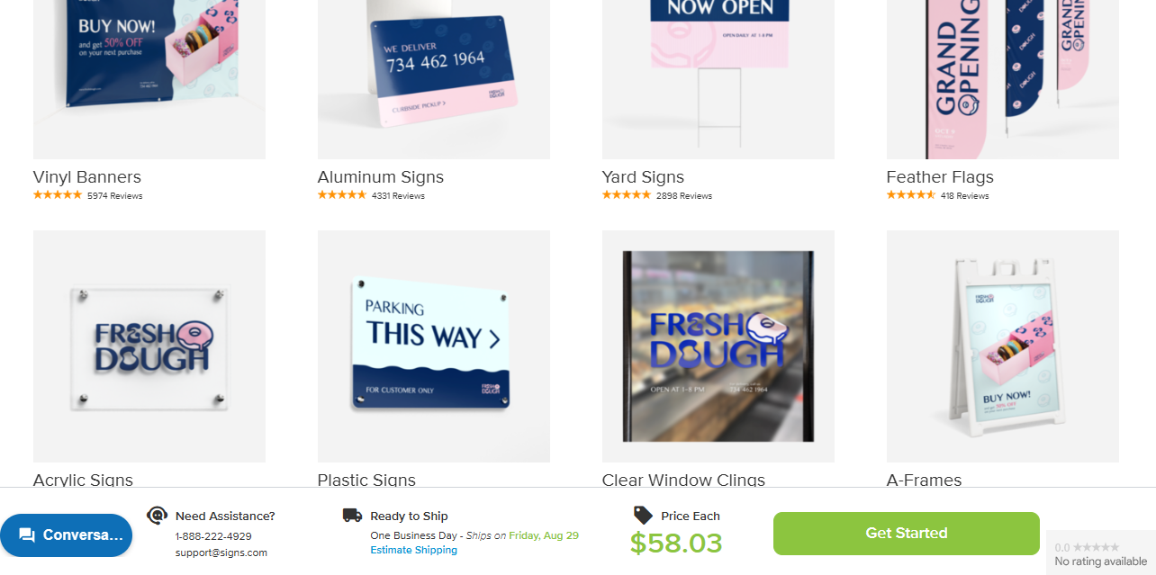 Signs.com provides an extensive online platform for designing and ordering custom signage and promotional materials, offering a vast selection that includes vinyl banners (13 oz and 18 oz), mesh and fence banners, feather flags, teardrop and spirit flags, retractable and pop-up displays, yard signs, A‑frame signs, aluminum and plastic signs, foam board, gatorboard, brushed or frosted acrylic fittings, metal and wood prints, canvas and mounted posters, decals (clear, frosted, perforated, permanent), vehicle decals, magnetic signs, window clings, carpet and floor decals, wall decals, lettering, quotes and stickers, postcards, rack cards, brochures, business cards, door hangers, flyers, hang tags, neck gaiters, promotional magnets, stretch table covers, table runners and tents, plus promotional items such as drinkware, notepads, pens, calendars and more.