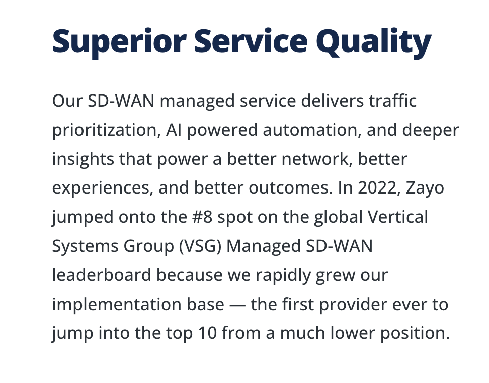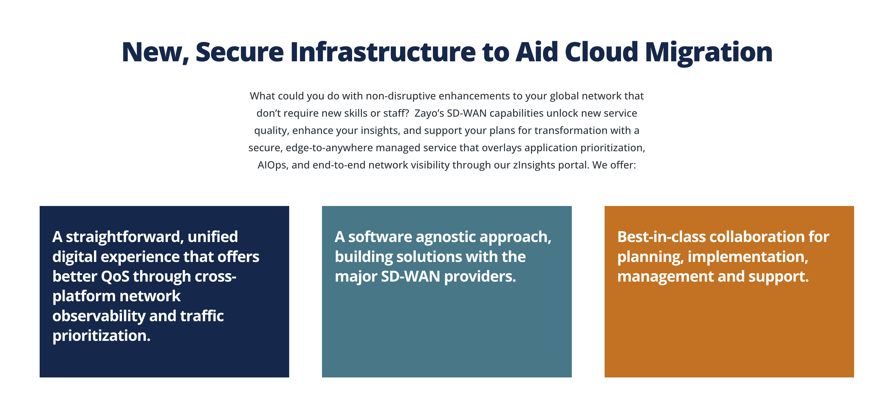 What could you do with non-disruptive enhancements to your global network that don’t require new skills or staff? Zayo’s SD-WAN capabilities unlock new service quality, enhance your insights, and support your plans for transformation with a secure, edge-to-anywhere managed service that overlays application prioritization, AIOps, and end-to-end network visibility through our zInsights portal. Whether you’re leading network operations for a regional, national, or multi-country organization, Zayo will help you connect what you do with a market-leading SD-WAN implementation that improves your WAN, boosts your performance, and delivers added cross-domain observability through our unique zInsights portal. Our SD-WAN managed service delivers traffic prioritization, AI-powered automation, and deeper insights that power a better network, better experiences, and better outcomes.