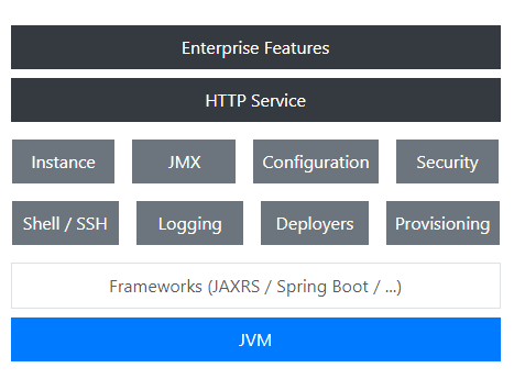 Karaf provides modulith runtime for the enterprise, running on premise or on cloud. Focus on your business code and applications, Apache Karaf deals with the rest. Karaf is the modulith runtime, supporting a wide range of frameworks and technologies. Karaf provides enterprise ready features: shell console, remote access, hot deployment, dynamic configuration and many more. Karaf projects provide additional features like clustering, complete monitoring and alerting, application repository. Run anywhere (on any machine with Java, cloud, docker images) running your applications with Karaf. Karaf is a lightweight, powerful, and enterprise ready modulith runtime. It provides all the ecosystem and bootstrapping options you need for your applications. It runs on premise or on cloud. This modulith runtime supports several frameworks and different kind of applications: REST/API, Web, Spring Boot, and much more.