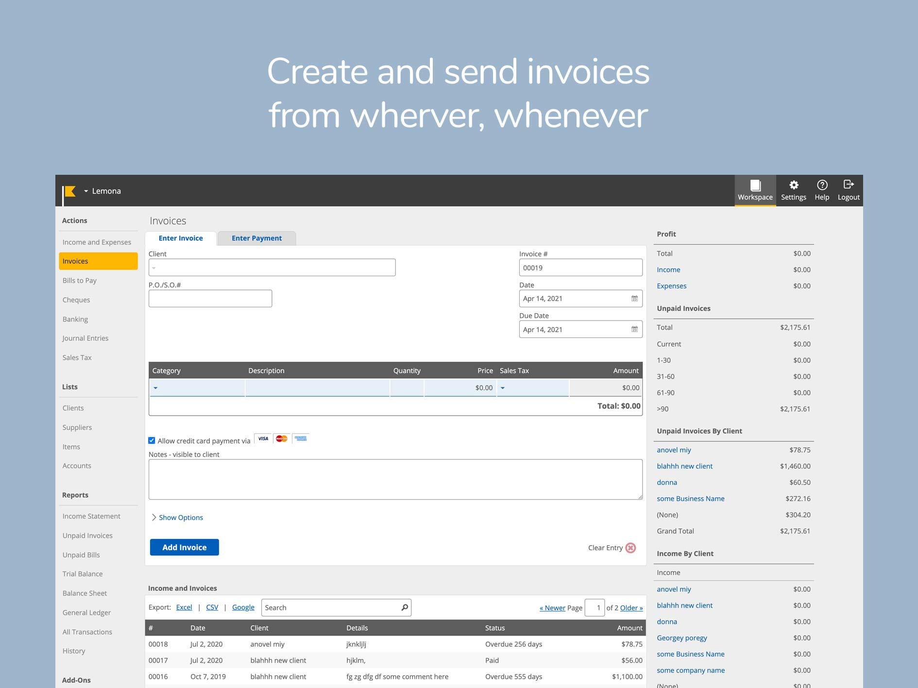 Create invoices in a snap, get paid securely online, and track and view your financial data on any device, anywhere, anytime, from one login.