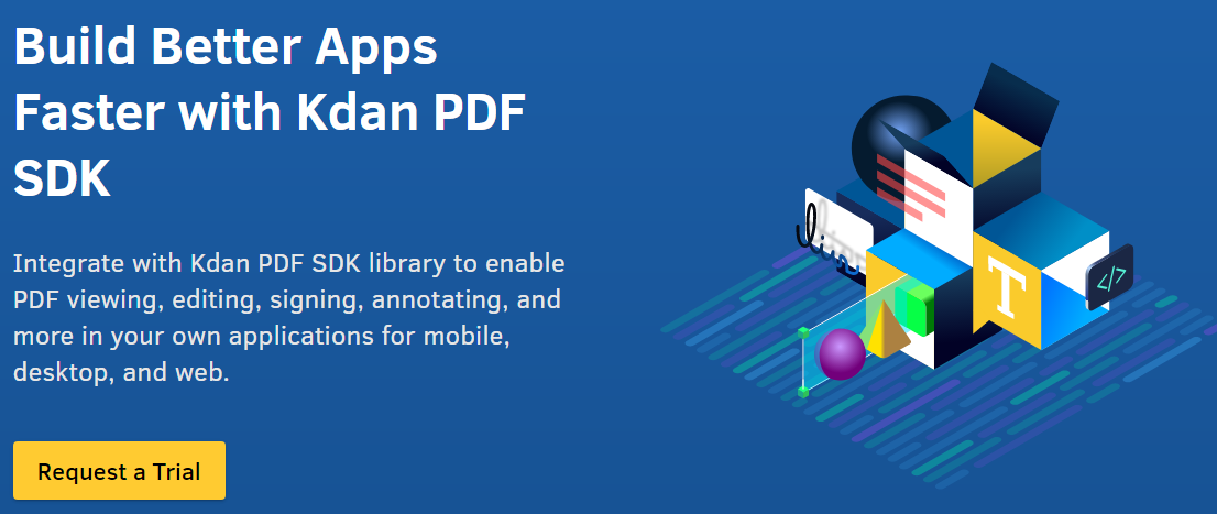Integrate with Kdan PDF SDK library to enable PDF viewing, editing, signing, annotating, and more in your own applications for mobile, desktop, and web. Kdan PDF SDK extends your app's features with a set of professional PDF capabilities on smartphones and tablets. We offer a variety of flexible kit plans. Developers can start with our demo version and select the plan that meets their needs. Kdan's PDF viewer engine has been perfected by 10 years of innovation and experience. We introduce regular updates to ensure the stability of your apps. The PDF SDK easily integrates within your app using our SDK documentation and gives you more time to focus on designing your app. Developers can design unique user experiences with fully customizable UI source code or use the default built-in Ul elements directly for your apps. No matter what platform you integrate with, our PDF SDK helps developers build powerful apps that can view, edit, and annotate PDFs.