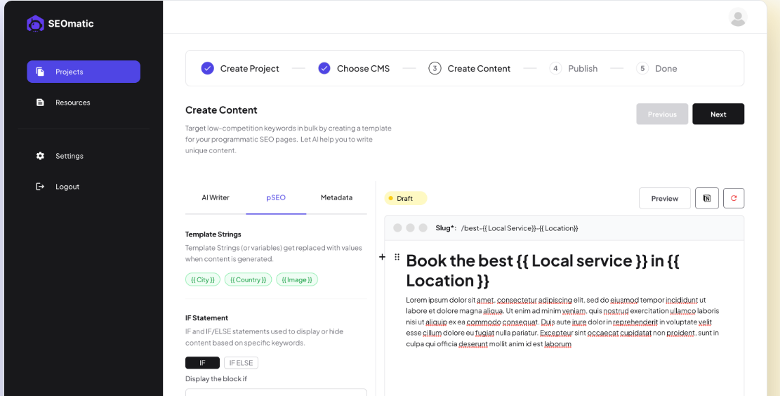 Automate content creation with programmatic SEO and AI. Publish more content, drive more traffic and target more long-tail keywords. All of our pages are optimized to load quickly. Search engines will love crawling your website.Y ou won't have to worry about SEO, we make sure your pages are optimized out of the box with best practices in mind. Publish high-converting landing pages and drive sales for businesses. Lead magnets and opt-in tools are integrated. Our Notion-like text editor improves writing with its intuitive interface for efficient content creation. Slash your content creation time by 75% with our AI assistant. Say goodbye to writing from scratch by generating complete, well-written blog posts with just one click. Save time and effort in creating new content, while avoiding the penalties and issues associated with duplicate content. Add 10 pages to your site every week. Or 1,000 or 1,000,000.