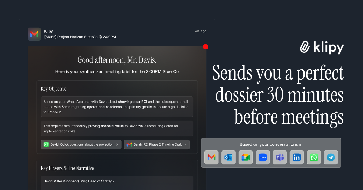 Stop wasting hours on manual meeting prep and tedious contact updates. Klipy connects to your email and calendar to automatically create powerful pre-meeting briefs on every attendee. See a complete timeline of every interaction with any contact, and let our AI find action items from your inbox without manual effort.