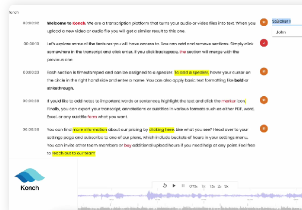 Upload any audio or video file. We accept all file types. Review your transcript with timestamps and speakers. Save & export your transcript as MS Word, PDF, SRT, VTT and more. Transcript quality depends on audio quality. Record clear audio to get accurate transcripts. Temi's free transcription editor lets you edit your transcripts online in minutes. Built by our machine learning and speech recognition experts. Quickly clean-up the provided transcript. Adjust the playback speed and skip around easily. Temi knows the timing of every word. Add any timestamps. We mark the change of every speaker and label them. Download your transcript into text (MS Word, PDF) or closed caption files (SRT, VTT).