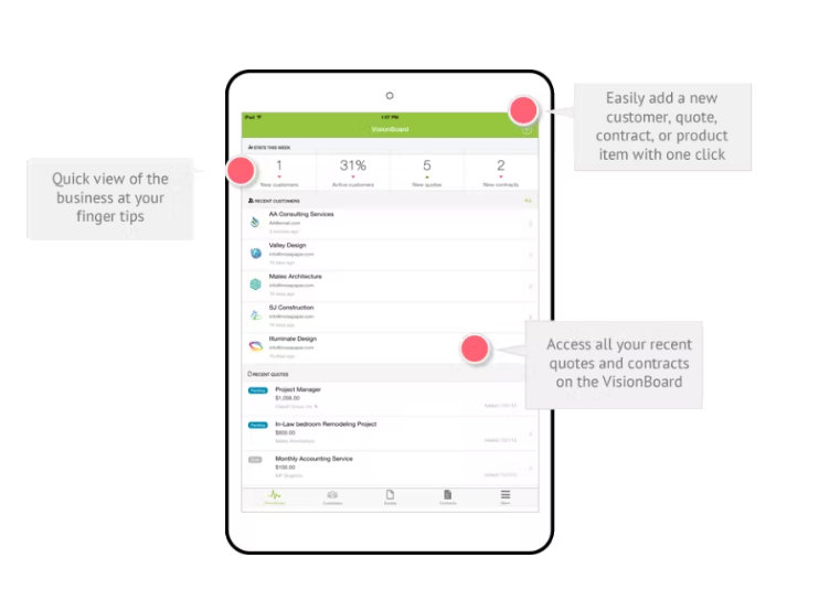 Quotes and contracts just got easier. Electronically sign and accept payments instantly. Create a professional quote or contract using one simple click. Send a quote or contract to be electronically signed. Accept payments from your customers instantly. Track, manage, and get insights into your business. We offer productivity tools to help you track and manage your work. A simple glance will tell you if a customer has viewed, signed, approved or rejected it. We provide a quick snapshot of your daily activities so you can focus on making your customers happy. With seamless integration from Stripe, you can collect payments from anywhere in the world for your freelance and small business. We offer a way for you to request payments from your customers though our app. Know your outstanding balances, send out requests and collect payments all in one centralized area.