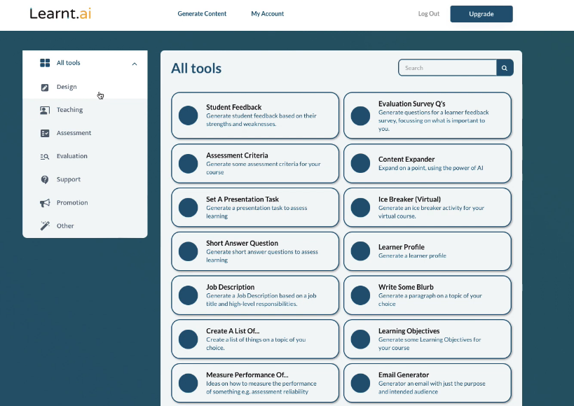 With Learnt.ai you can save time and effort by automating the creation of high-quality lesson plans, learning objectives, assessment questions, and a range of other resources. Learnt.ai is designed to augment not replace; inspiring you to create engaging content that aligns with best practices in education, making it easier for you to deliver effective and impactful lessons to your students. Introducing Learnt.ai - a revolutionary collection of AI-powered content generation tools that are specifically designed to support the common writing tasks of educationalists and learning and development professionals. Imagine being able to generate learning objectives on any topic of your choice, create engaging icebreakers and activities, write assessment questions with ease, and so much more. Powered by the cutting-edge GPT language generation model, Learnt.ai harnesses the power of AI to generate human-like text that will amaze you.