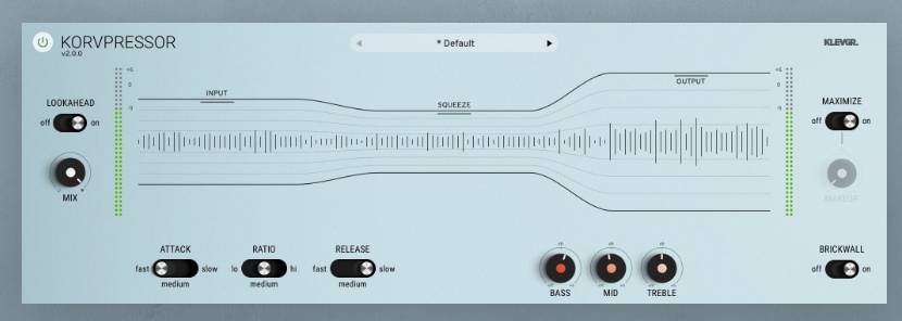 If you work with audio, you will eventually need a good compressor in your toolbox. Korvpressor is an adaptive compressor/limiter, designed for all purposes in audio treatment. It has a super-simple UI with a unique approach on how to tame and visualize a compressor, now also with some added controls to make it even more versatile. The basic controls are still minimalistic – set the input gain, level of compression, and output gain. The compression algorithm was designed with transparency in mind, and Korvpressor will sound great on almost any kind of sound; all from a vocal track to a full-blown mix. If you push it even harder, it gives a nice squeezing effect. This is the main control of Korvpressor. Imagine that you're pinching the sound waves, so the more squeeze you want, the further down you should go with this handle. A musical and versatile EQ to fine-tune your finished sausages.