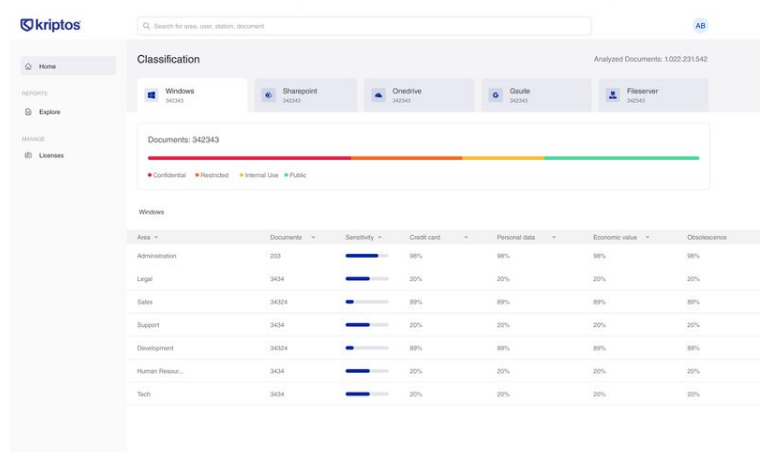 We use Artificial Intelligence in order to automatically classify unstructured data. Our platform provides you with a clear view of document sensitivity by area. With intuitive graphics, you can identify which areas of your organization handle the most sensitive information and see the percentage breakdown. Make informed decisions to safeguard your most valuable assets. Classify and label millions of documents using Artificial Intelligence. Dashboard with analytics and statistics in real-time. Our cutting-edge classification technology empowers you to pinpoint precisely who, where, and how your organization accesses its most sensitive documents. With our intuitive web platform, gain insights into user behaviors and identify areas with the highest levels of access to confidential information. Take control of your data security like never before. Our solution is fully customizable to your business language and self-learns in the process to get better classification results.
