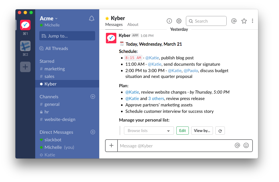 All-in-one suite of Slack apps to boost your team productivity. Manage projects per #channel. Track and assign tasks. Organize standup meetings. Review team workload. Create polls and surveys. Schedule messages. Get reminded. All inside Slack. Get a complete suite of powerful apps to help your team work better and faster in Slack: Task and project management, automated standup meetings, instant polls, team surveys, message scheduling, meeting planning, personal to-do list and with templates you can customize and configure your own micro-apps. Kyber is ideal to coordinate work between your marketing, product management, sales and engineering teams or to run more efficiently individual teams. Stop switching between Slack and unnecessarily complex, external apps: get more work done in Slack, by adding simple to use, fully integrated, intelligent Kyber apps. Instantly provision Kyber to your entire team without creating new accounts.