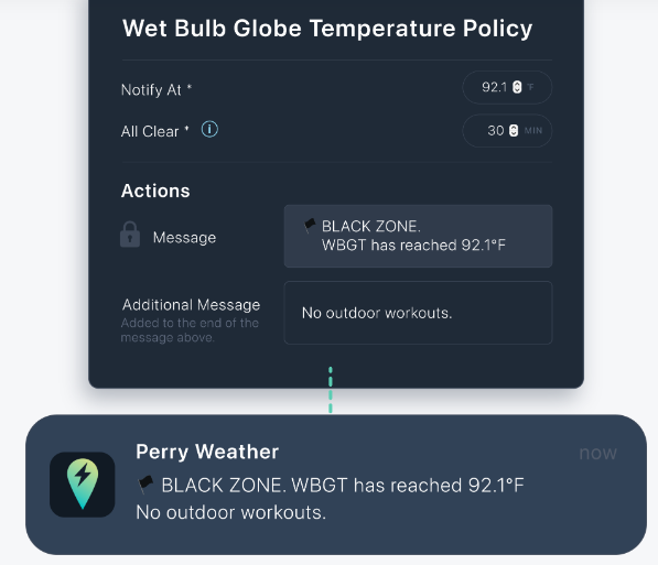 Perry Weather’s on-site weather stations monitor conditions at your exact location, sending mobile and audio/visual alerts tailored to your weather policies, like WBGT and lightning, empowering your team to make safety decisions with real-time accuracy. They’re based on data from many miles away, so you’ll end up with inaccurate information. They can’t tell you exactly when weather conditions exceed your safety policies. There’s no way to quickly and easily notify your team of changes. Get weather conditions from your precise location. Perry Weather’s on-site weather stations give you real-time, site-specific data for more accurate weather monitoring and alerts. Perry Weather integrates your organization’s weather policies on lightning, heat stress, and more, so you’ll always stay in compliance. Perry Weather’s automated alerts send out detailed instructions to everyone involved, so they can take consistent action quickly.
