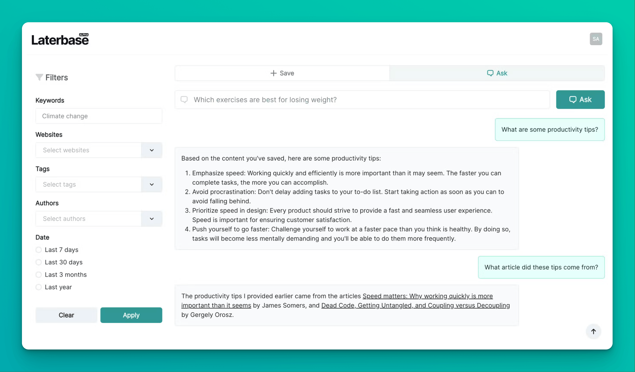 Meet Laterbase - an AI-powered bookmark manager that goes beyond simple organization. Chat directly with your bookmarks to quickly retrieve information and extract key insights, ensuring you never miss what's important. Instantly capture any website to your Laterbase, chat-powered insights for every bookmark.