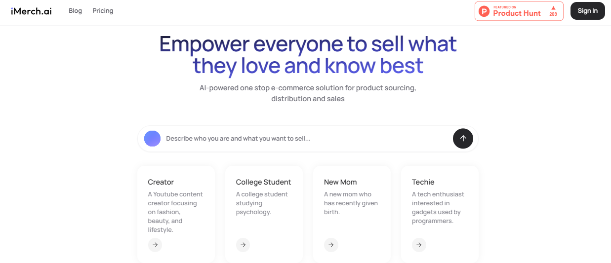 AI-powered one-stop ecommerce solution for product sourcing, distribution and sales. iMerch.ai provides personalized product recommendations based on your content and intelligent design suggestions tailored to your brand. It enables real-time customization with instant previews, allowing for seamless product personalization. The platform operates on a print-on-demand fulfillment model, eliminating the need for upfront costs or inventory management. This approach reduces financial risk and allows for flexible product testing. iMerch.ai offers automated product listing and optimization, integrated analytics and performance tracking, and multi-platform selling capabilities. Users can set up a custom storefront with their branding, enhancing their online presence. iMerch.ai aims to simplify the ecommerce process, making it accessible for creators and entrepreneurs to monetize their passions without the complexities of traditional online retail.