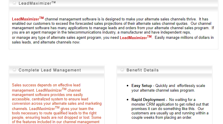 LeadMaximizerTM It is a Web-based partner relationship management software application that enables companies to closely monitor and manage alternate sales or lead referral programs. Easily manage and track all your leads and sales from outside reps or agents with one tool. Companies that depend on revenue from alternate channels such as agents, independent sales reps and manufacturers reps. Virtually any company that has an outside sales force can use our technology to take sales to the next level. View key performance indicators unique to each permission level. No waiting for a monster CRM application to get rolled out that promises it can do something like this. Our customers are usually up and running within a couple weeks from placing an order.