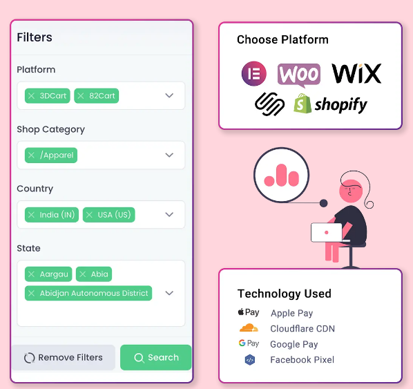 Find eCommerce stores worldwide and make them your clients. A perfect solution for acquiring leads, enhancing data, performing market research, and collecting alternative investment data. Discover stores in your area of expertise and collaborate with them. Turbo charges your prospecting. Study 8.9 million active stores from the worldwide database. Use segmentation and filters that help to define the perfect audience. Study what's hot in the market across industries and geographies. My Lead Fox enables you to go deep in your prospecting so you can have all the insights to win your clients. We work our best to have the store data up-to-date. Suitable for marketing agencies, app developers and new business ideas. The easiest eCommerce data platform for lead generation and market research. We believe in fair and sustainable pricing that helps your business grow. The data includes firmographic, social media, contact information, and technographic attributes of each store.