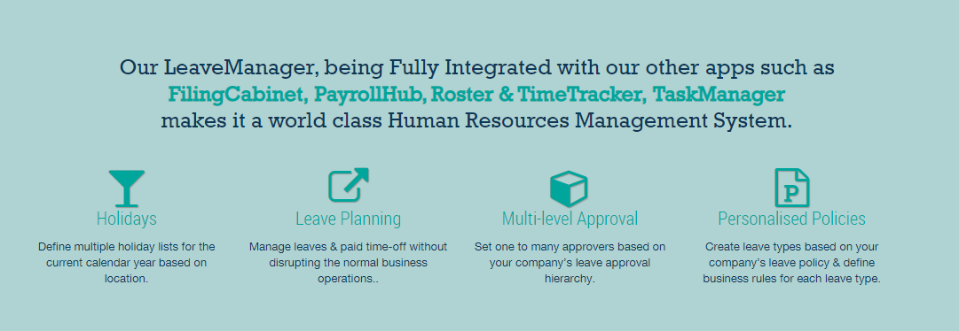Define multiple holiday lists for the current calendar year based on location. Manage leaves & paid-time-off without disrupting the normal business operations. Set one to many approvers based on your company’s leave approval hierarchy. Create leave types based on your company’s leave policy & define business rules for each leave type. Approval hierarchy based on departments - with multi-level and cross-departmental approvals. Easy sort & reporting for Human Resources & Department Managers based on department, month, staff & / or Leave type. Integrated with our Roster and TimeTracker system to provide a complete cloud-based LeaveManager facilitating attendance tracking. Save on HR time; interactive with the option to question the requestor or approver anytime. Serves as ‘Employee Self service’ tool so staff can interact & track the leave approval process online.