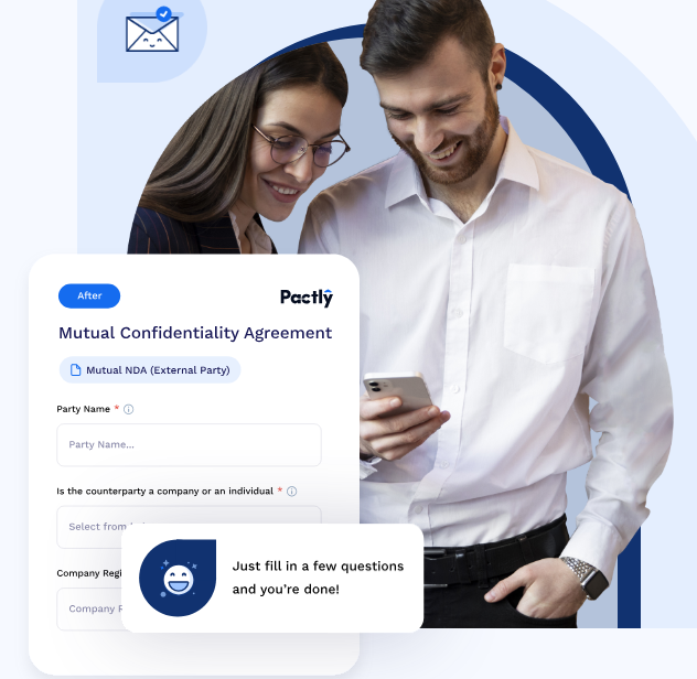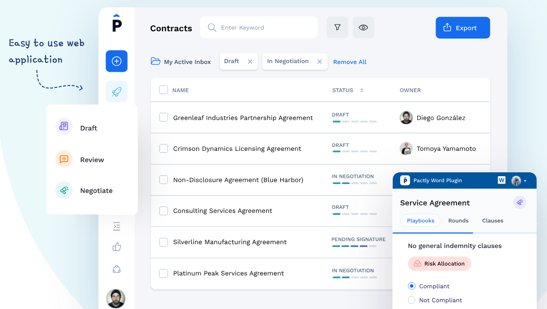 Meet the contract management software that makes it easy to create, review, negotiate, and manage all your contracts. Finalize contracts faster, increase collaboration, and get more work done with Pactly. Our all-in-one contract management solution makes legal jobs faster and easier at each stage of the contract lifecycle management process. So you can close more deals, protect your interests, and stop letting contracts slow you down. Enable sales, procurement, and HR teams to create professional draft contracts without waiting on legal. Flexible templates and fill-in-the-blank questionnaires do the heavy lifting, so everyday contracts take minutes, not days. Instantly identify redlines, compare versions, and access institutional preferences and historical contract language. Access contracts, templates, and signed documents on demand. Review version timelines, access historical contracts, and never miss a deadline or renewal with automated reminders for critical milestones.