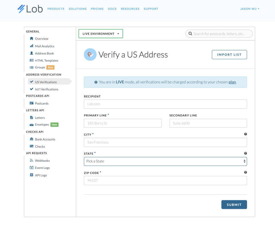 Lob automates and simplifies direct mail and address verification, giving businesses greater flexibility, visibility, and accuracy of offline communications and data. Trigger on-demand postcards, letters, and checks directly from your CRM or customer data systems. Correct, standardize, and cleanse address data for assured delivery with instant verification across 240+ countries and territories. Eliminate the hassle of vendor management with automated production and postage across a global network of vetted commercial printers. Automatically track production and delivery for each piece of mail you send to meet compliance requirements and measure campaign performance.