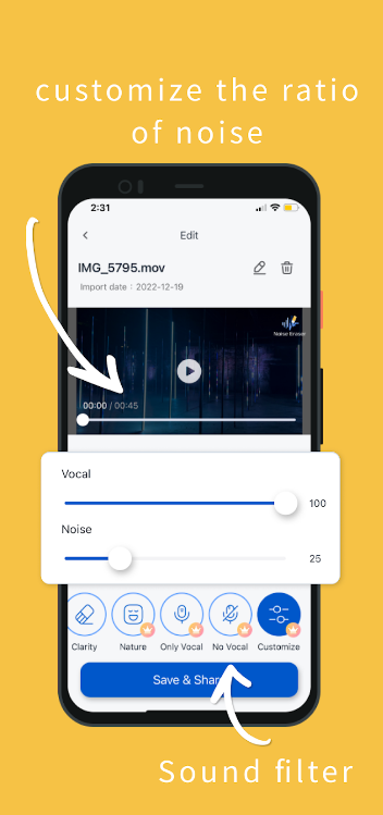 Just one click to get a pro audio effect! And it only takes 1 minute for a 5 minutes video clip. Through Noise Eraser, now you can adjust voice/noise volume as you like. Through 10k+ of the human voice, noise training resources and adapted professional noise reduction methods, having a personal audio editor whenever you need is not a dream! Using our default ratio to get a realistic sound without losing your background noise. You still can manually adjust the voice/noise ratio.