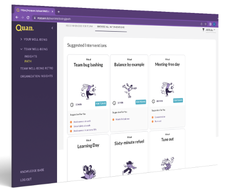 Support the whole team by breaking well-being down into measurable quarterly goals and rituals to improve ways of working. Individual therapy and self-care tools aren't enough. Team members complete an evidence-based well-being assessment measuring five dimensions, mind, body, meaning, social-connectedness, and self-fulfilment, providing invaluable insight into the underlying reasons for their current state. Assessments are 100% guaranteed private, no one else can see your individual results. The well-being data collected in the assessments are aggregated and anonymized, highlighting the team's top well-being strengths and risks and their underlying sources. Quan then guides managers and teams through quarterly conversations about team well-being, allowing them to effectively choose which areas to focus on first, and to build the psychological safety they need to openly discuss their ways of working.