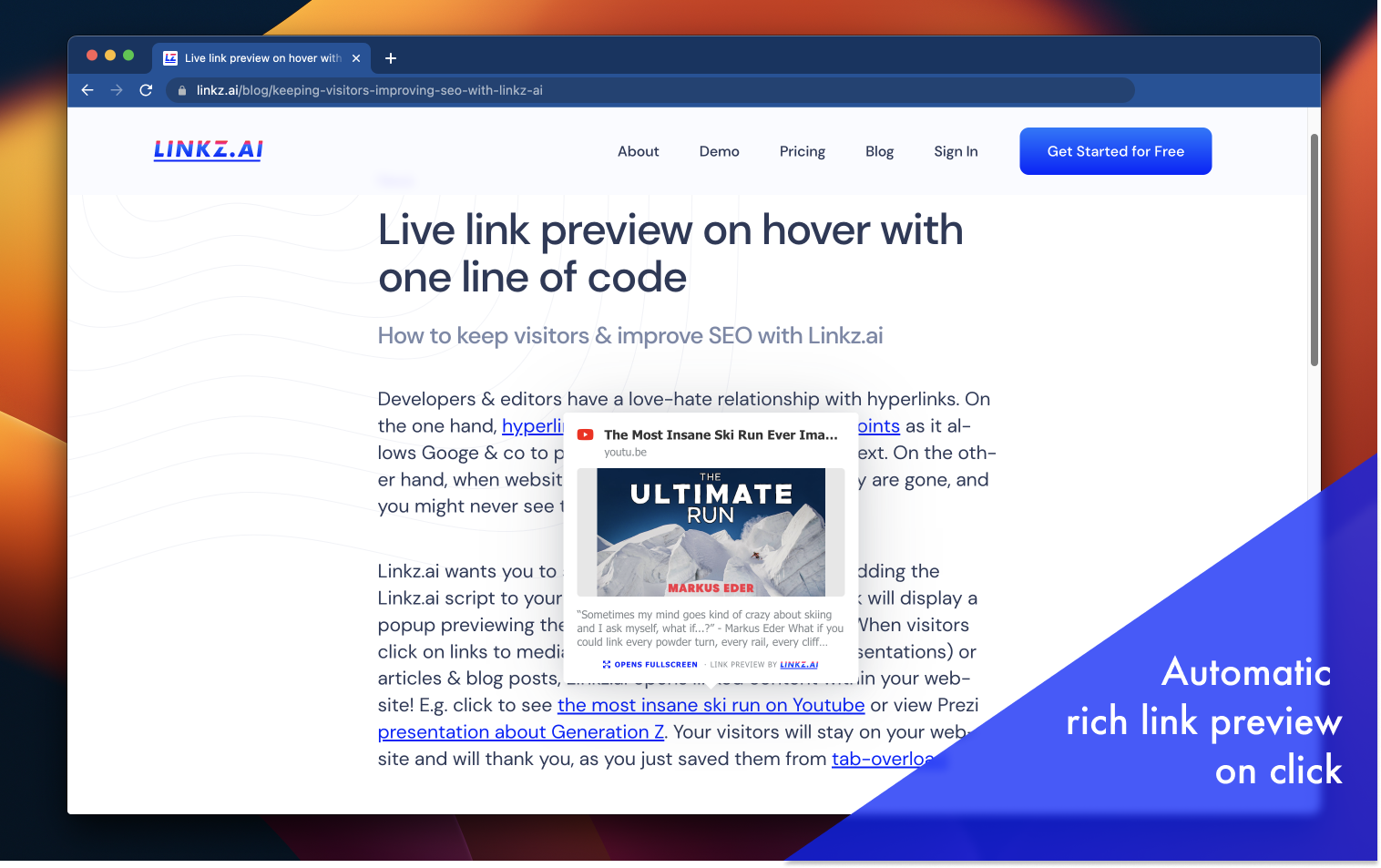 Install Linkz.ai in 2 minutes on your website or blog and instantly get automatic rich link previews on hover. Linkz.ai previews help your visitors to get context from linked content without bouncing between browser tabs, and, most importantly, without leaving your site.