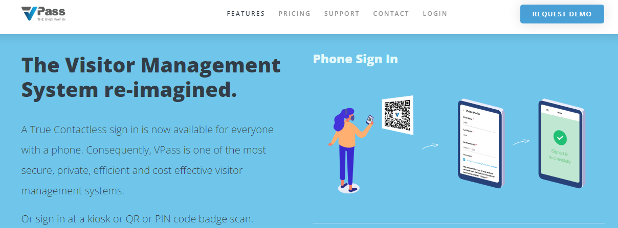 Unlike other sign-in systems, the visitor completes the sign-in entirely on their own phone. Setup and run VPass without costly tablets, printers, badges/lanyards. Sign in quick wherever a QR code poster is placed. Unlimited Locations available in the Premium Plan. Configure your account Forms & Visitor Types to meet your needs. Changes are pushed live to all devices automatically. Setup staff and regular visitors with phone Profile, QR Coded badge or PIN code. Add documents, images, conditions of entry text and signature box to your sign in forms. Collect a document from a visitor as they sign in. Can be saved into phone Profile for future sign ins. Details saved into your Profile will pre-fill form fields at each sign in where VPass is used. The visitor’s smart phone is now their very own quick and safe sign in device. Therefore, instead of purchasing expensive tablets, security stands, printers and printer consumables, VPass gives you a cost effective means to manage visitors.